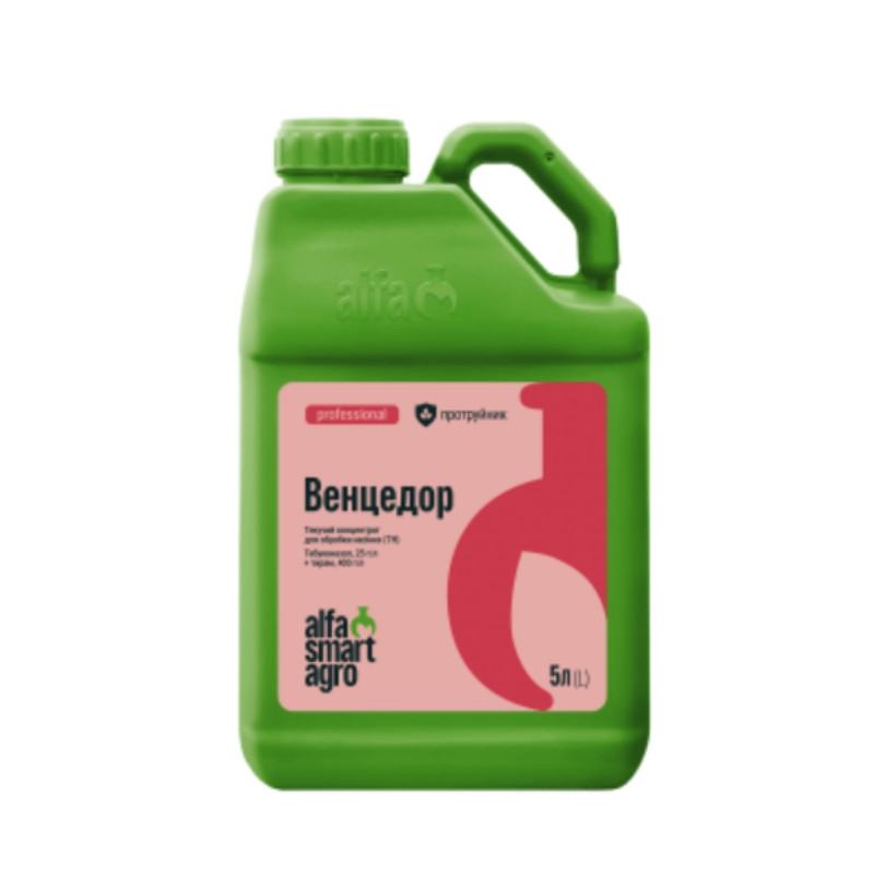 Имеет в своем содержании действующие вещества – 25 г/л тебуконазол + 400 г/л тирам. Так как Венцедор имеет два компонента, то может уничтожать болезни на поверхности семени, внутри него и в земле.