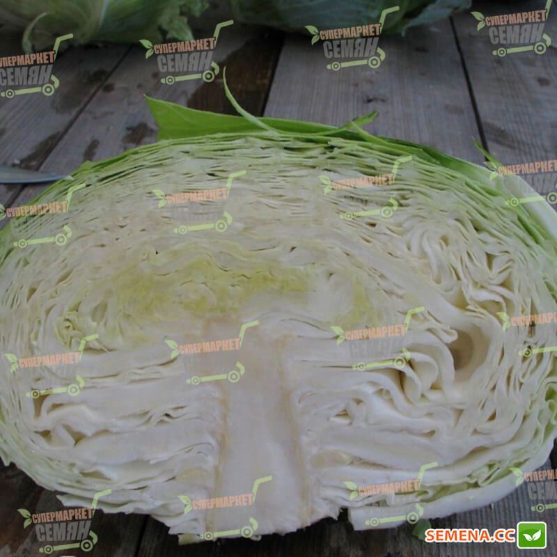 Кочаны светло-зеленые, плоскоокруглые по форме, очень однородные, белые внутри, весом 2,5-3,5 кг.