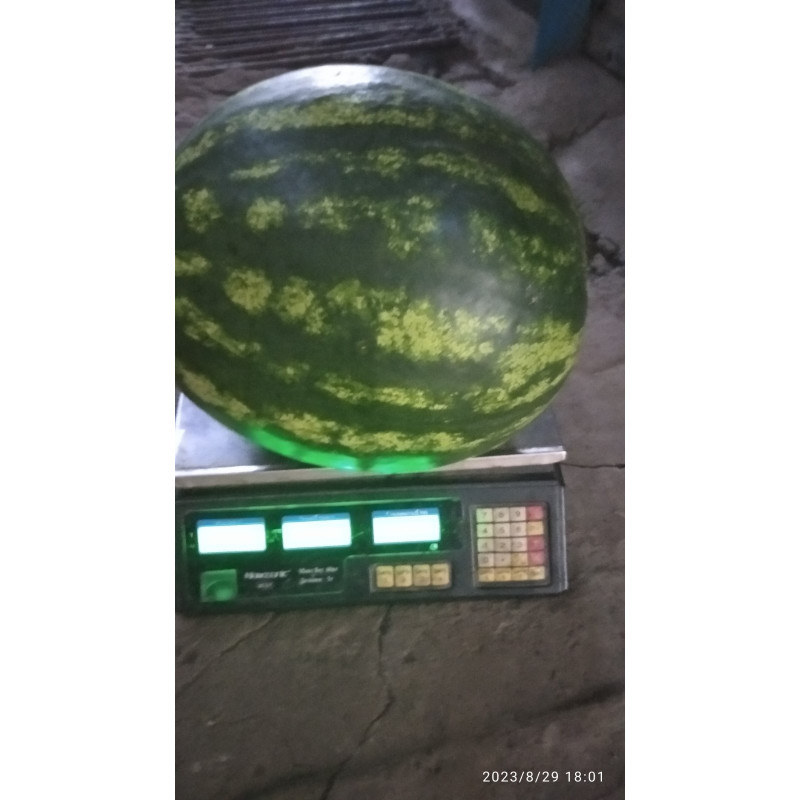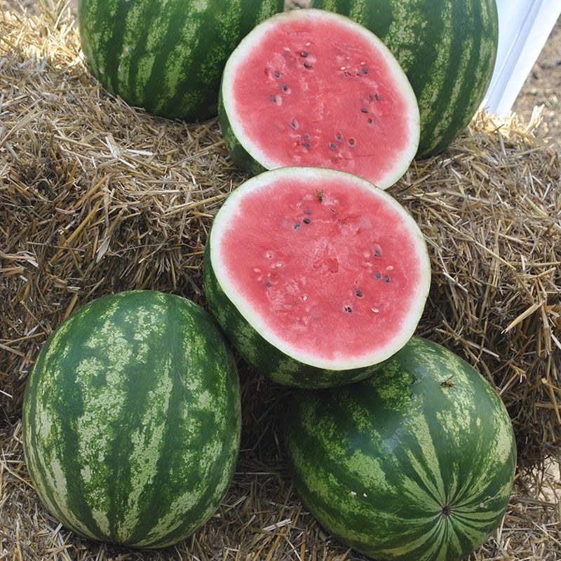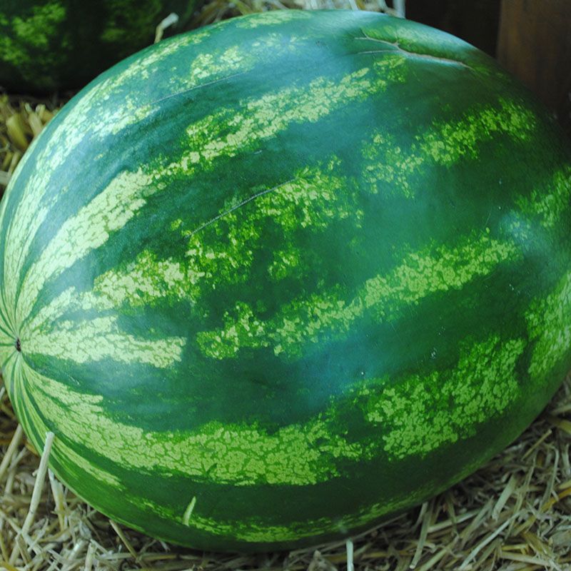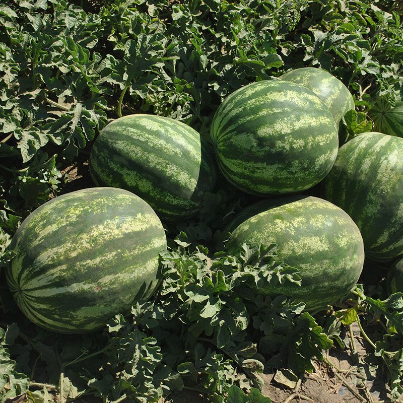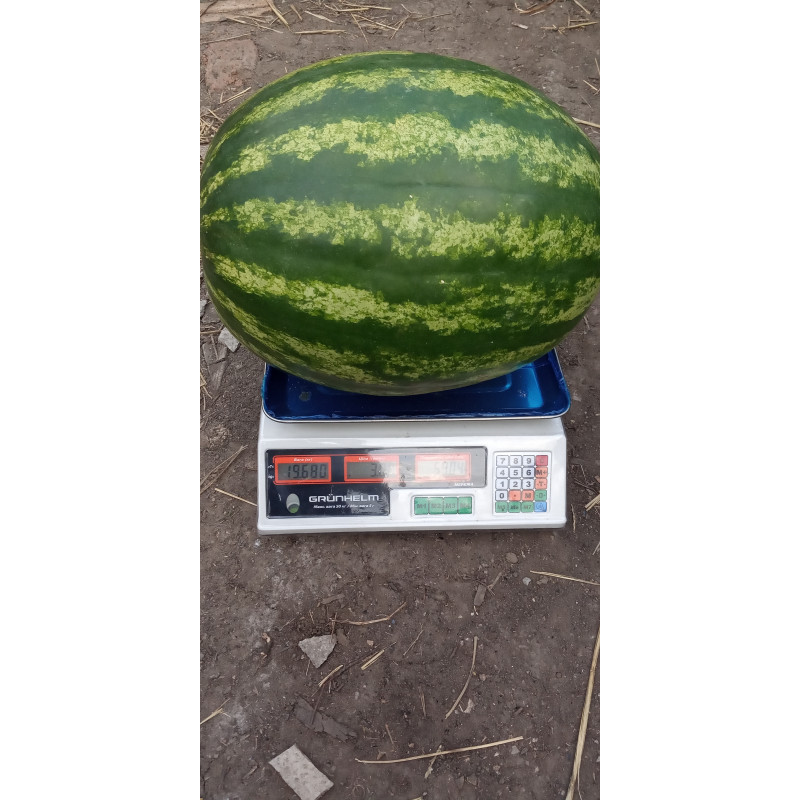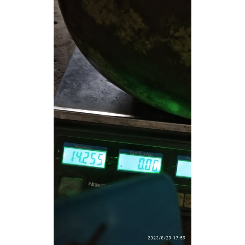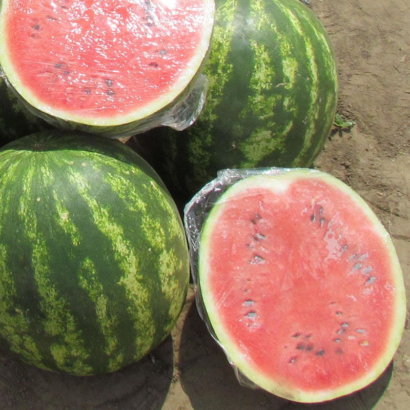 Плоды округлые, привлекательные, с темными полосами, очень однородны, массой 9-12 кг. Мякоть плотная, сочная, алого цвета с красивой внутренней структурой. Высокие вкусовые свойства.