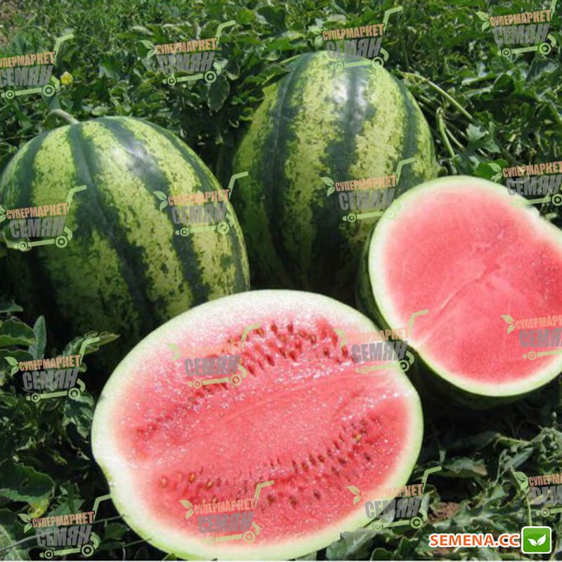 Характеристика плодов – Плоды круглой формы, с темными полосами, гладкие, с привлекательным глянцем, весом 6-9 кг. Мякоть очень нежная, светло-красного цвета, с высокими вкусовыми показателями. Семена маленькие, темно-коричневой окраски.