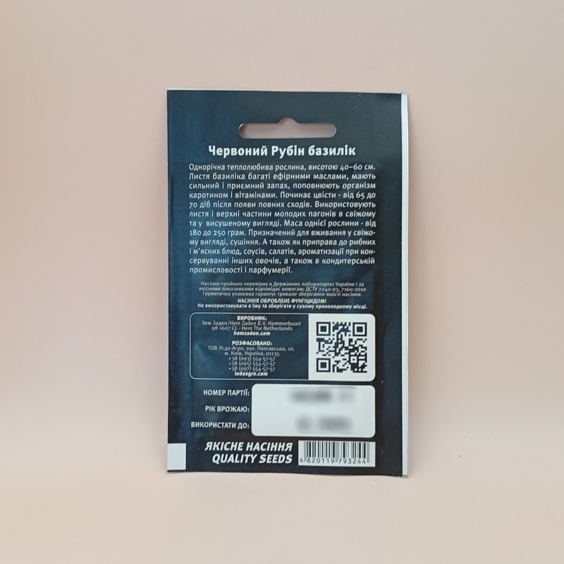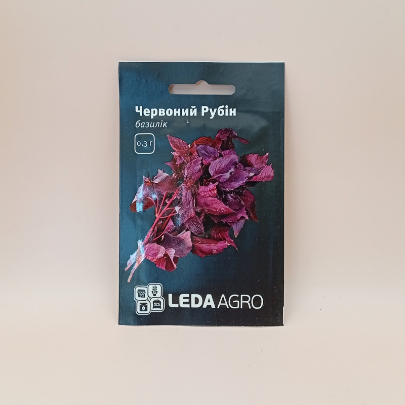 Красный Рубин - сорт базилика от компании Hem Zaden. Начинает цвести - от 65 до 70 суток после появления полных всходов. Растение формирует ароматные, тёмно фиолетовые листья с приятным запахом, сочные фиолетовые побеги. Масса одного растения - от 180 до 250 грамм. Предназначается для употребления в свежем виде, сушки.