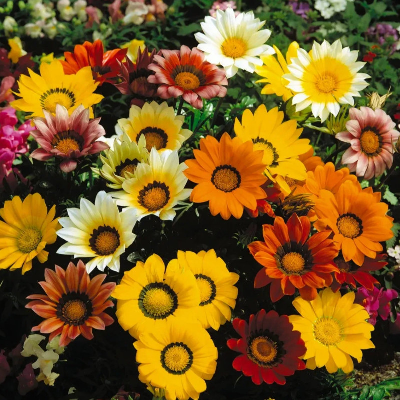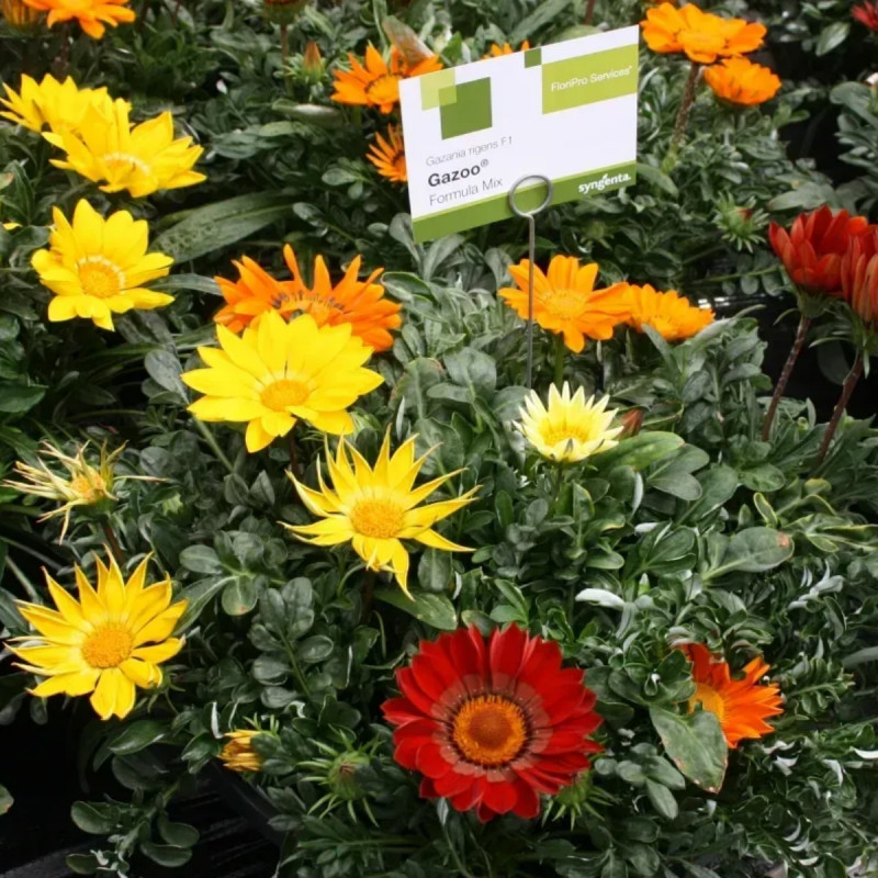 Газания жестколистая Газу F1 смесь (Gazania rigens Gazoo F1 mix) – серия, которую можно отличить от других серий газаний, благодаря очень большим цветам, достигающим 12-14 см в диаметре, прочным цветоносам и сильнорослому габитусу растения.