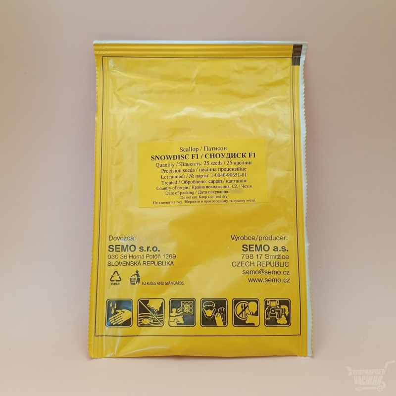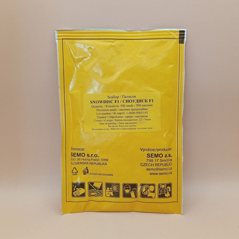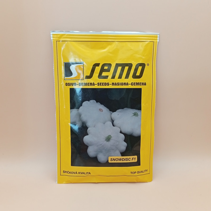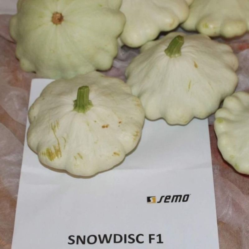 Сноудиск F1 - гибрид патиссона от компании Semo. Высокая урожайность. Период вегетации - от 40 до 60 суток. Плоды имеют дисковидную, гладкую форму, массу - от 300 до 400 грамм. Поверхность плодов белого цвета, слабосегментированная. Кора является деревянистой, тонкой. Мякоть хрустящая, белая, малосочная, несладкая. Отлично подходит для консервирования.
