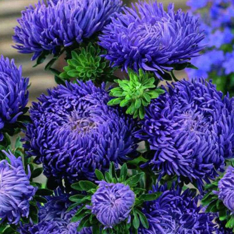 Астра Синий Магнит формирует до 15 мощных стеблей-цветоносов с махровыми, крупными цветами, синего цвета. Цветет с мая до заморозков.