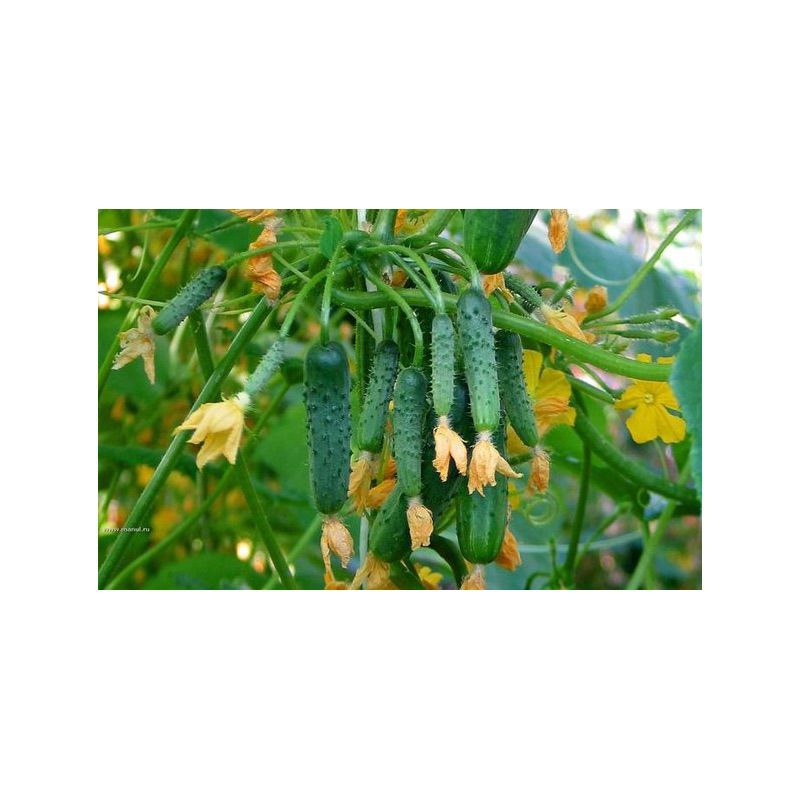 Уникальный партенокарпический пучковый корнишонный гибрид для защищенного и открытого грунта, сочетающий в себе скороспелость, стабильно высокую урожайность (плодоносит в любых температурных условиях), ограниченное ветвление и красивые зеленцы. Растения преимущественно женского типа цветения. В условиях почвенной засухи и сильной жары количество мужских узлов может возрастать; при пониженной температуре воздуха мужских узлов практически не бывает. Наличие нескольких мужских узлов не является отрицательным признаком – наоборот, это способствует «разгрузке» растений и активному наливу завязей при большом количестве сформированных зеленцов на растении.