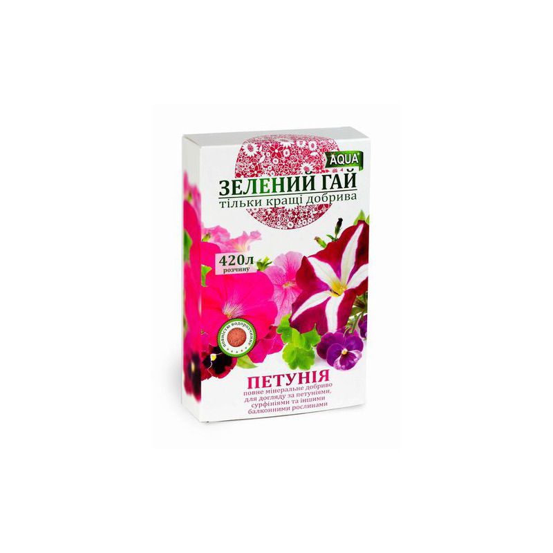 Зеленый Гай Аква Петуния - это быстродействующее минеральное удобрение, которое используется для петуний и других растений, выращиваемых на балконе и террасе. Данное удобрение стимулирует быстрый и равномерный рост. Своим воздействием повышает в значительной мере сопротивляемость к неблагоприятным факторам внешней среды. Стимулирует корнеобразование и рост листьев. Поддерживает яркость листвы и цветков.