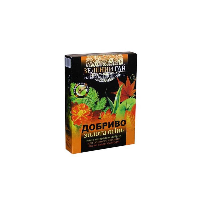 Зеленый Гай Золотая осень - это комплексное минеральное удобрение, которое используется для всех видов растений приусадебного участка в осенний период. Данное удобрение стимулирует быстрый и равномерный рост. Своим воздействием повышает в значительной мере сопротивляемость к неблагоприятным факторам внешней среды. Стимулирует корнеобразование и рост листьев. В значительной мере способствует безболезненному пробуждению после зимнего периода.