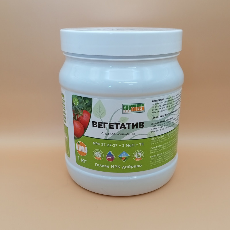 ЖЕЛ Вегетатив (GEL Vegetative) (25-25-25) - данный препарат является удобрением специально разработанным для сбалансированного снабжения корневой системы и листового апппарата, что позволяет увеличивать урожай и его качество. Благодаря своему уникальному составу, данное удобрение снижает симптомы стресса и защищает растения от вредных факторов окружающей среды. Данный препарат является полностью растворимым и не содержит нерастворимых элементов. При применении GL-удобрения, оно очищает капельницы, что улучшает работу поливной системы. Данное удобрение используется в дозе 0.25-0.5 грамм на литр поливной воды. Рекомендуется применять с каждым поливом.