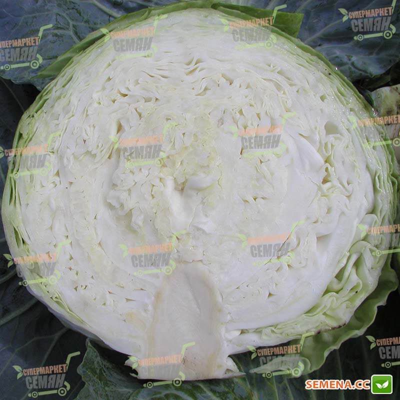 Плод правильный, однородный, круглый, весом до 3 кг. Внутри плотный, белоснежный. Имеет короткий внутренний кочан. Листы тонкие и гладкие. Очень вкусный.