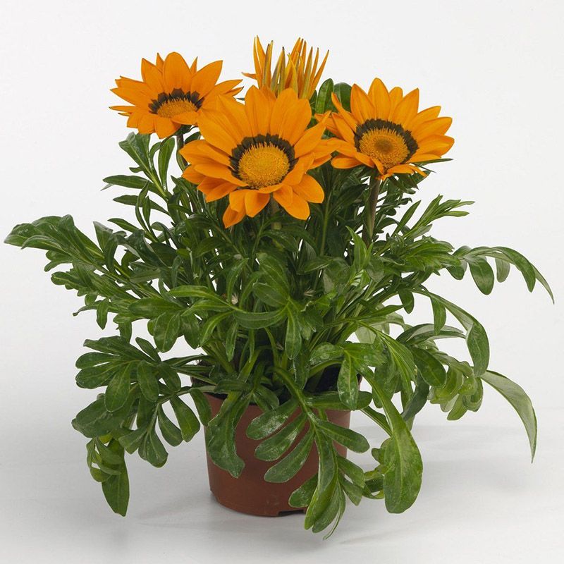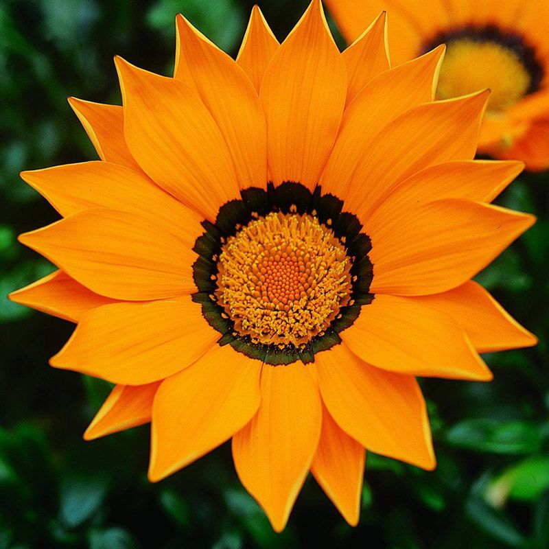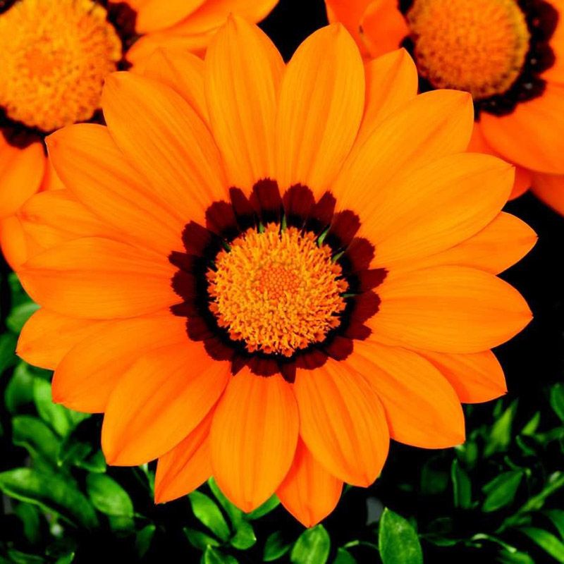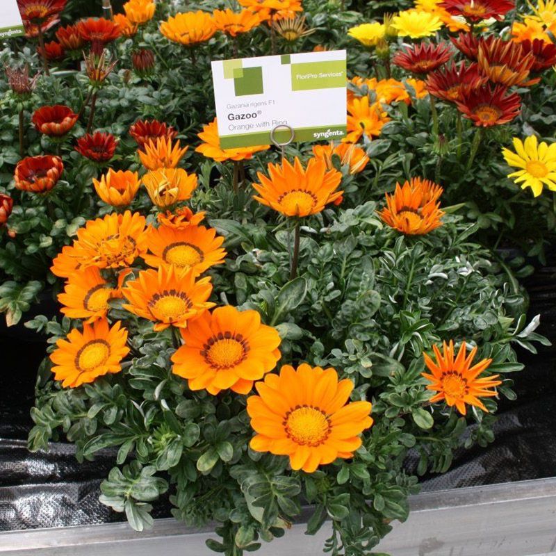 Газания жестколистая Газу F1 оранжевая с ободком (Gazania rigens Gazoo F1) – серия, которую можно отличить от других серий газаний, благодаря очень большим цветам, достигающим 12-14 см в диаметре, прочным цветоносам и сильнорослому габитусу растения.