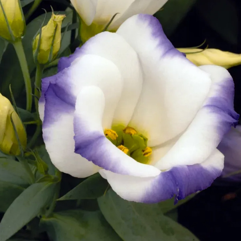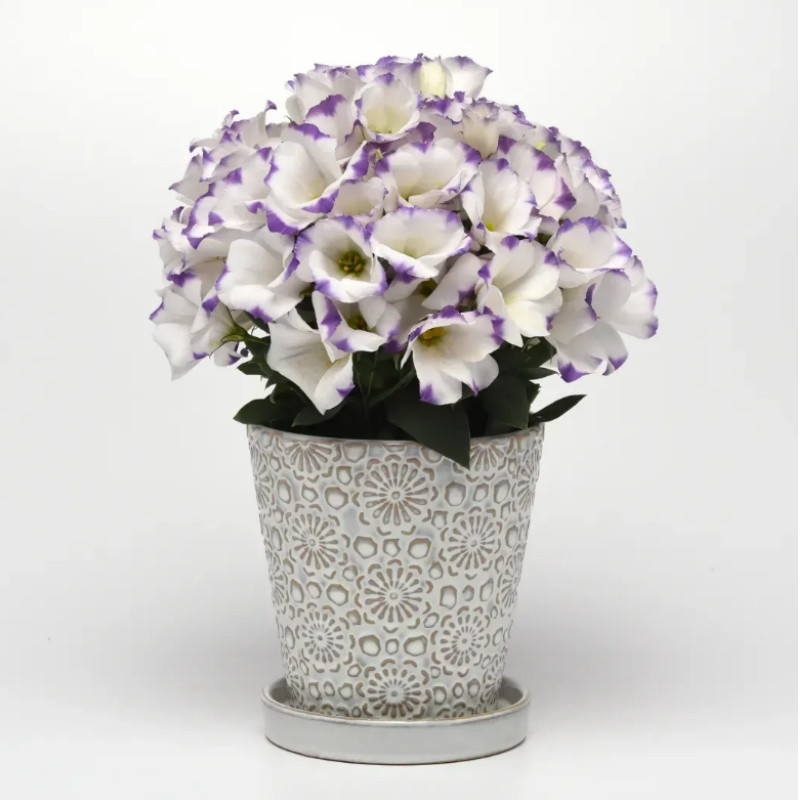 Эустома Сапфир F1 бело-синяя - низкорослая серия высотой 10-15 см, шириной 10-15 см, горшковая.