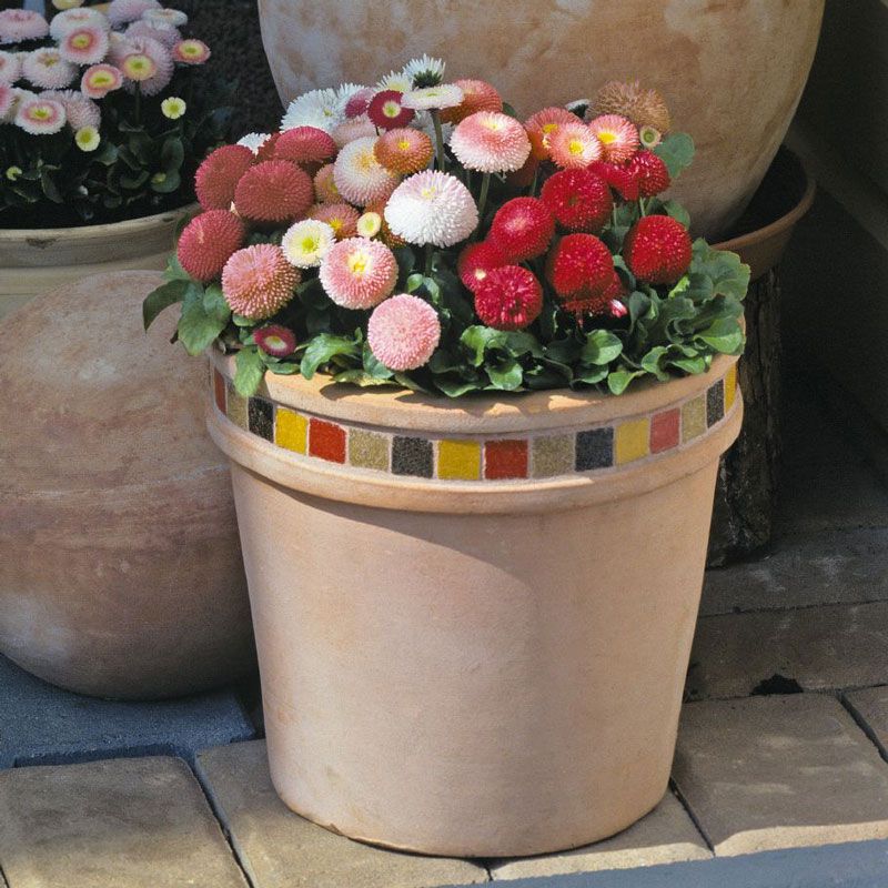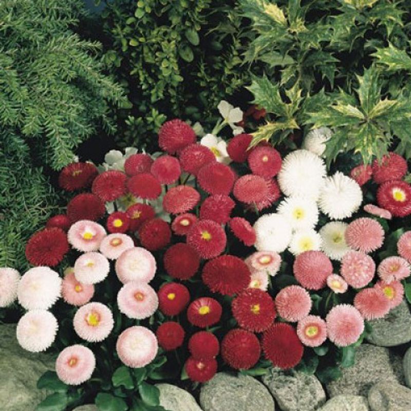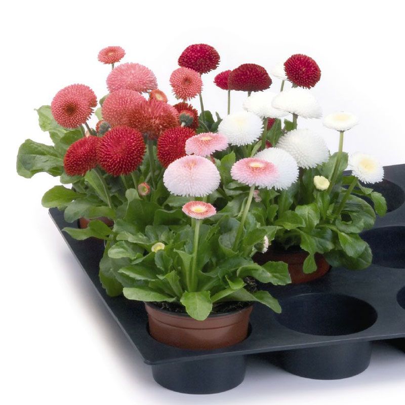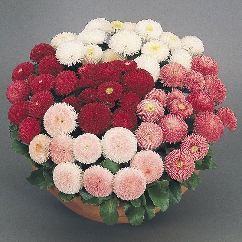 Маргаритка Тассо смесь (Mix) - усовершенствованная серия помпонного типа. Густо махровые цветки Тассо достигают 5 см в диаметре, что в 2 раза больше обычных Помпонетт!