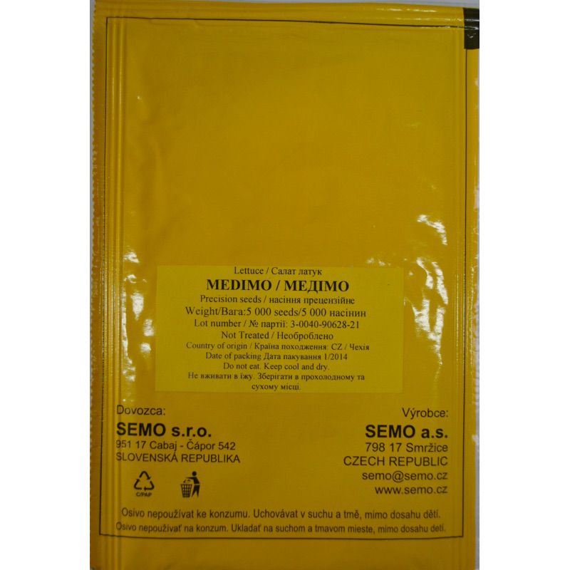 Медимо – сорт салата, типа Айсберг. Является среднеранним. Кочан крупный, плотный. Имеет сочные насыщенно зеленые листья. Устойчив к гнили. Отличный вкус и товарное качество. Идеален для салатных промышленностей.