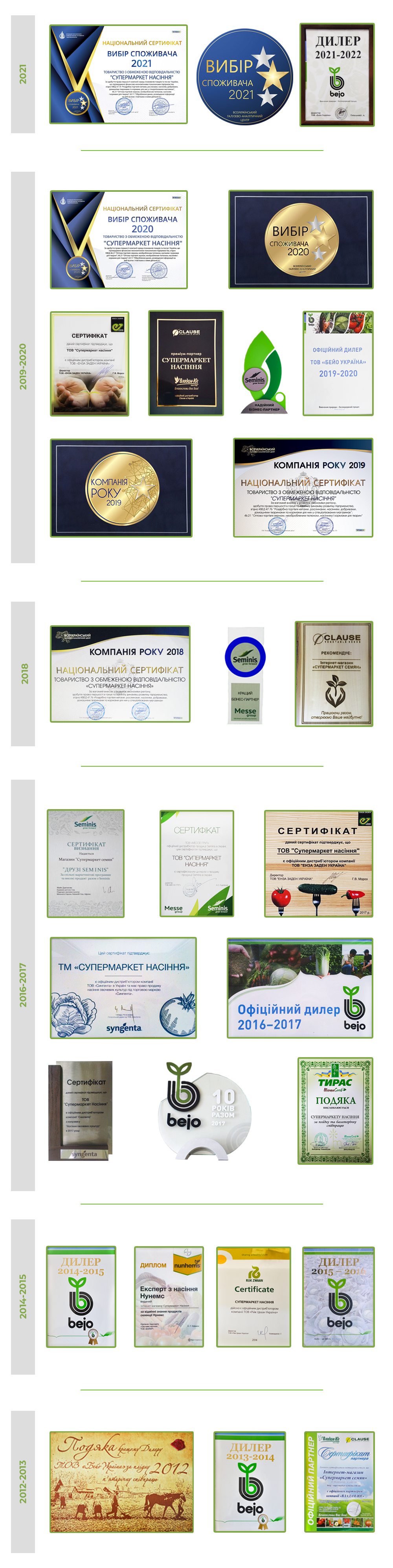 Так, мы с большой гордостью имеем честь быть названными «экспертами» в официальном дистрибьюторстве компаниями «Syngenta» и «Rijk Zwaan», получили сертификат признания «Друзья Семинис» за высокий уровень продаж и грамотную маркетинговую программу, стали экспертами в ассортименте «Nunhems», стали официальными партнерами компании «CLAUSE», на протяжение четырех лет являемся одним из лучших дилеров компании «Bejo Zaden» (что подтверждается не только сертификатами, но и благодарственной грамотой от руководства компании).