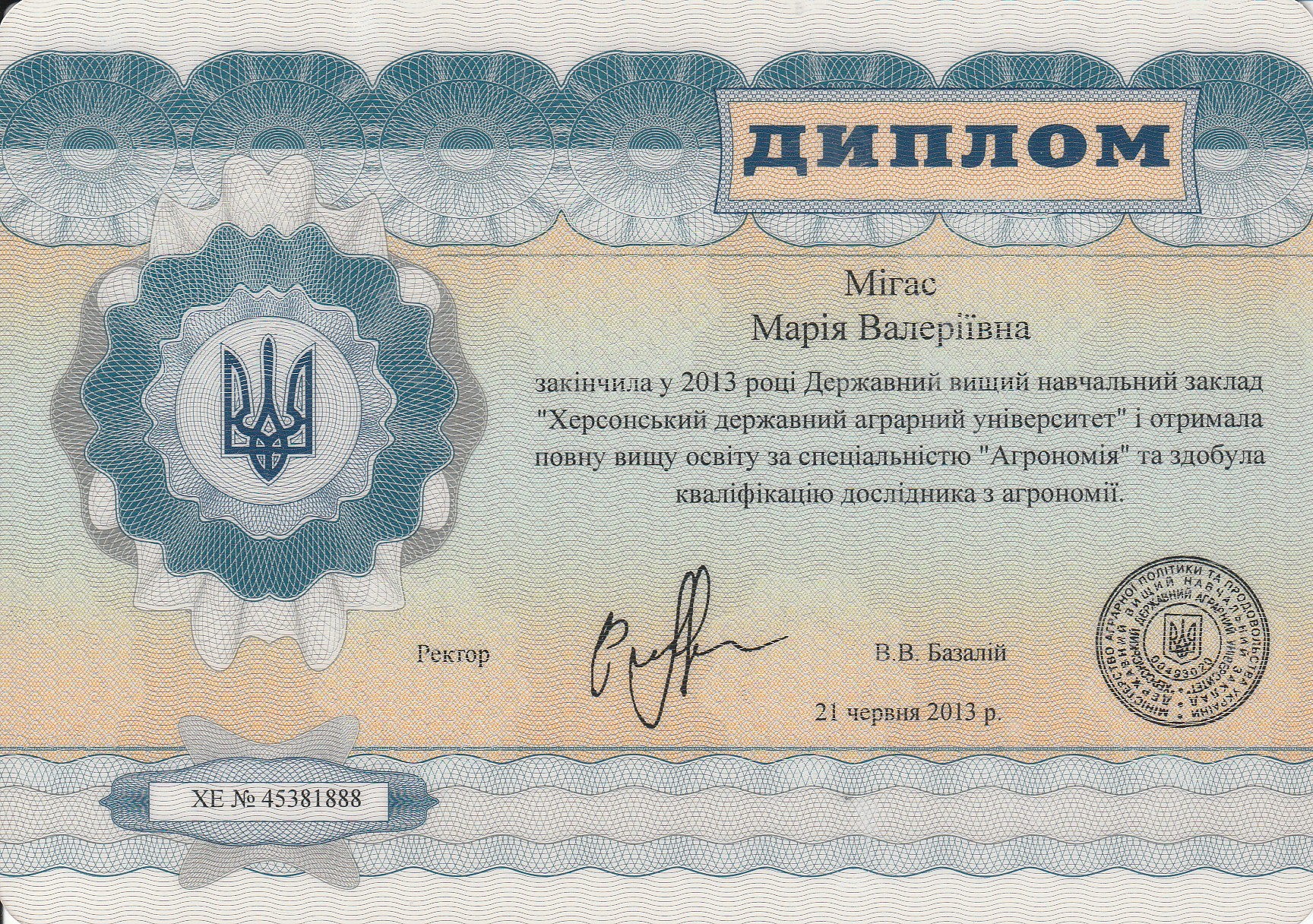 В 2013 году получила степень магистра агрономии, а также второе образование — бакалавра по экономике предприятия.