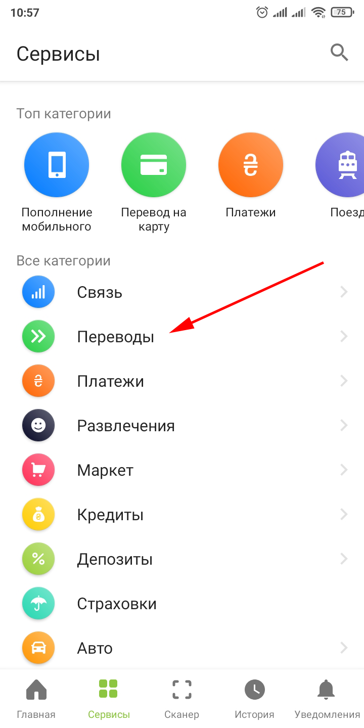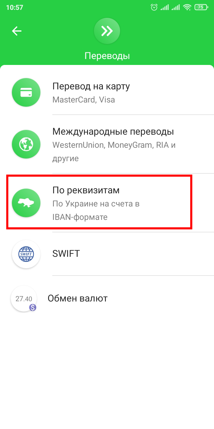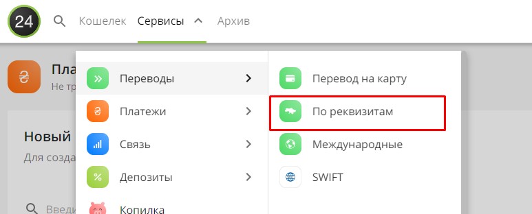 2. В верхнем меню нажмите Сервисы – Переводы – По реквизитам.