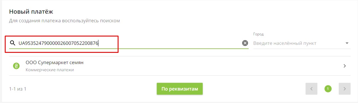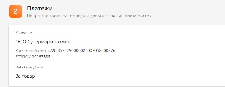 Мы указываем р/с перед номером счета для удобства ориентирования в сообщении. Если все данные введены верно, Приват24 автоматически укажет под строкой наш расчетный счет, как на примере ниже. Нажмите на «ООО Супермаркет Семян».