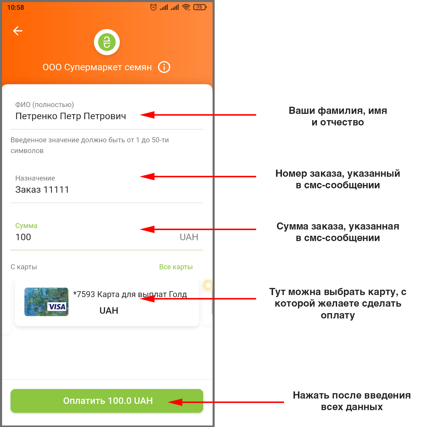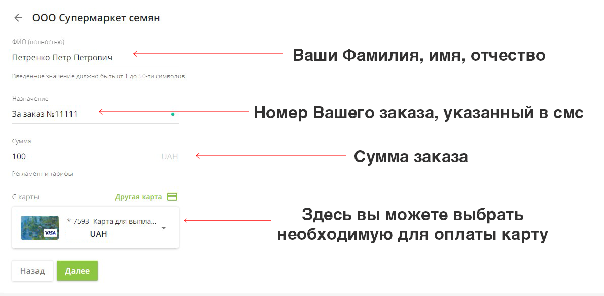 6. В новом окне в полях введите Ваши данные клиента: ФИО, номер заказа и сумму, которую необходимо оплатить и нажмите кнопку «Оплатить ___ UAN».