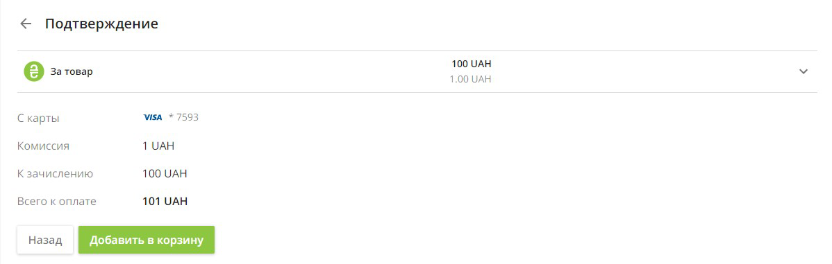 7. Сразу после нажатия, Вы увидите окно с подтверждением всех введенных данных сумы. Нажмите на кнопку «Оплатить» и Ваша оплата отправится на наш расчетный счет.