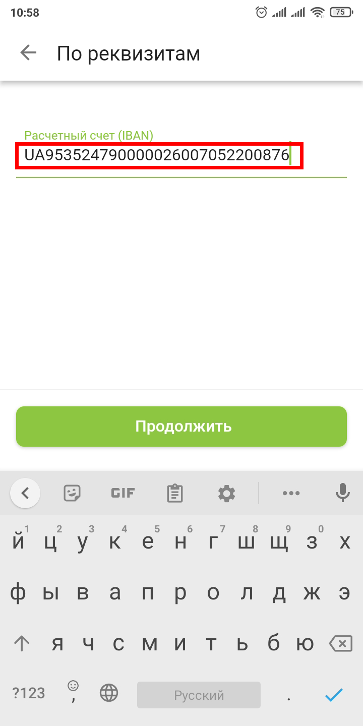 Обратите внимание: данные счета IBAN важно вводить, начиная с заглавных букв и без пробелов. Например: UA011122222222244444666555566