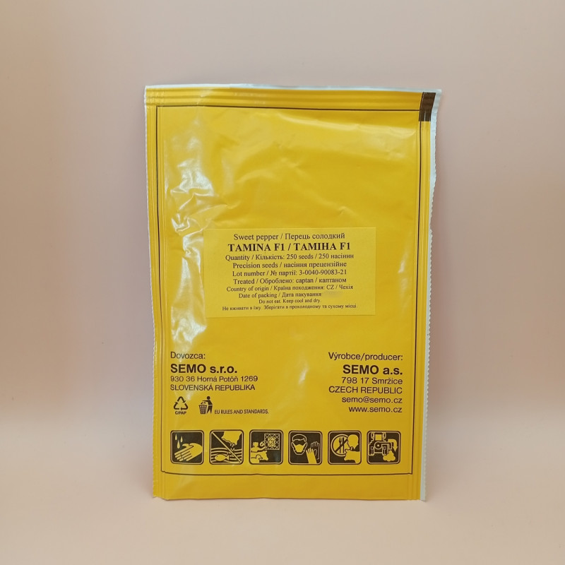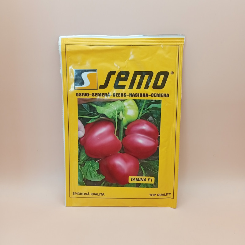 Таміна F1 - гібрид солодкого перцю. Є раннім, дуже врожайним, потужним, низькорослим. Період вегетації 65 днів. Плід зелений / темно-червоний, плоскоокруглий, ребристий, товстостінний 7-8 мм. Високі смакові якості. Лежкий. Транспортабельний. Зростання в плівкових теплицях і відкритому грунті.