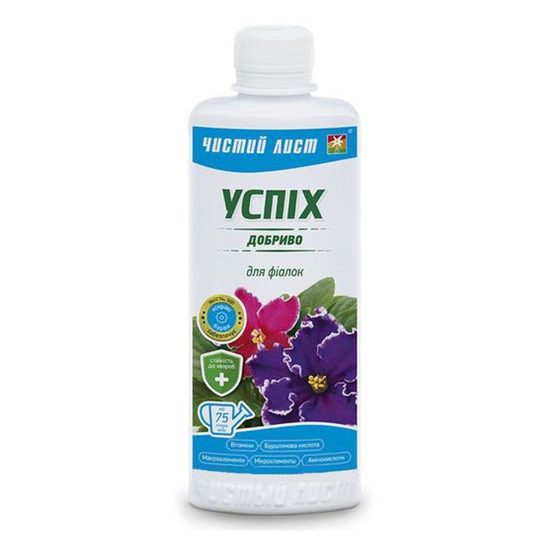 Успіх для фіалок - це комплексне добриво є вузько спрямованим. У своєму складі має всі потрібні макро- і мікроелементи в доступній і збалансованій формі. Після обробки препаратом пригнічується ріст патогенів, стимулюється більш сильний розвиток кореневої системи і підвищується природна стійкість рослин перед хворобами.