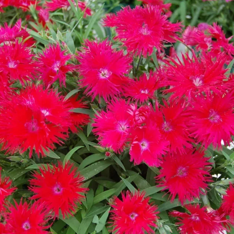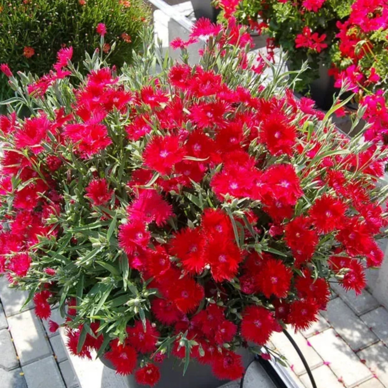Висота в горщику 15-20 см, ширина – 20-25 см. Ажурні квіти червоного кольору.