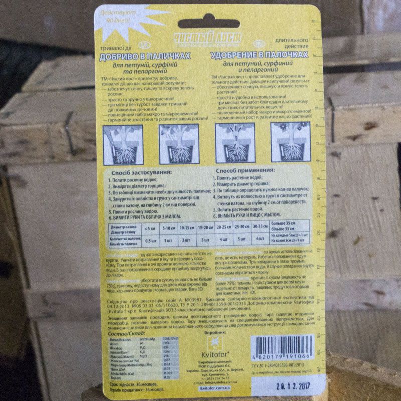 Чистий лист (для петуній і пеларгонії) - дане добриво представлено у вигляді паличок. Є препаратом з тривалою дією. Забезпечує повноцінне підживлення усіма необхідними мікро- і макроелементами протягом 3-х місяців. Своїм впливом покращує ріст і формування рослин, також покращує зовнішній вигляд.