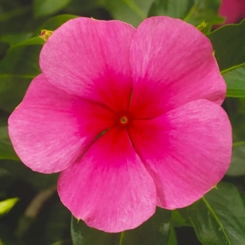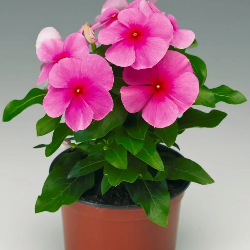 Квіти в катарантуса Sunstorm дуже яскраві і великі, листя темно-зелена блискуче.