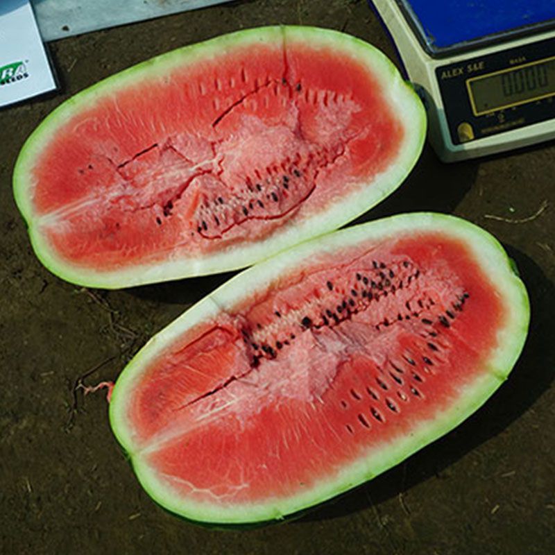 Характеристика плодів – Плоди овальної видовженої форми з темно-зеленими смугами, середньою масою 12-14 кг. М'якоть дуже щільна, хрустка, червоного кольору і відмінна на смак.
