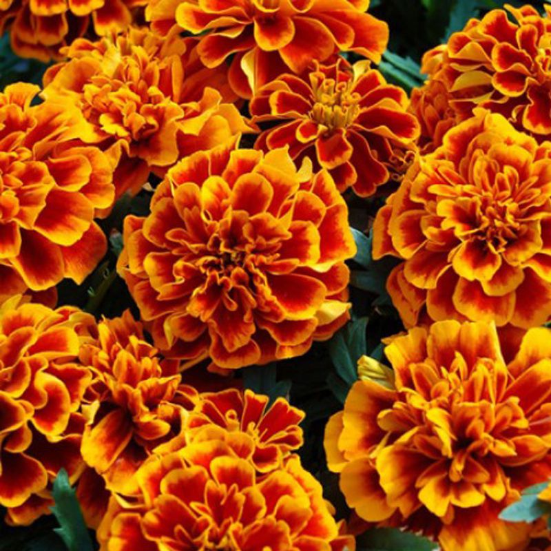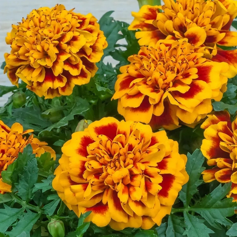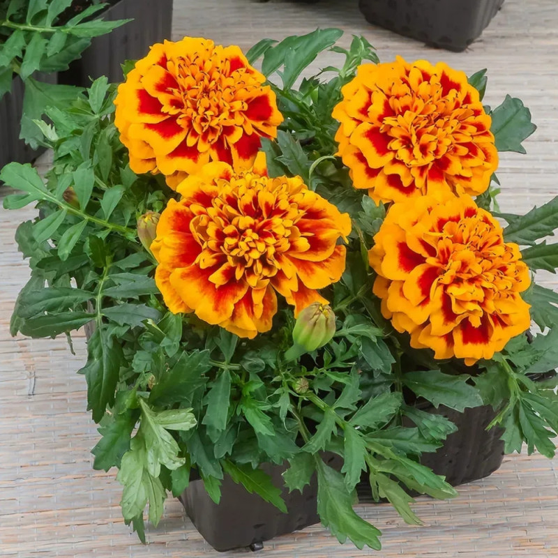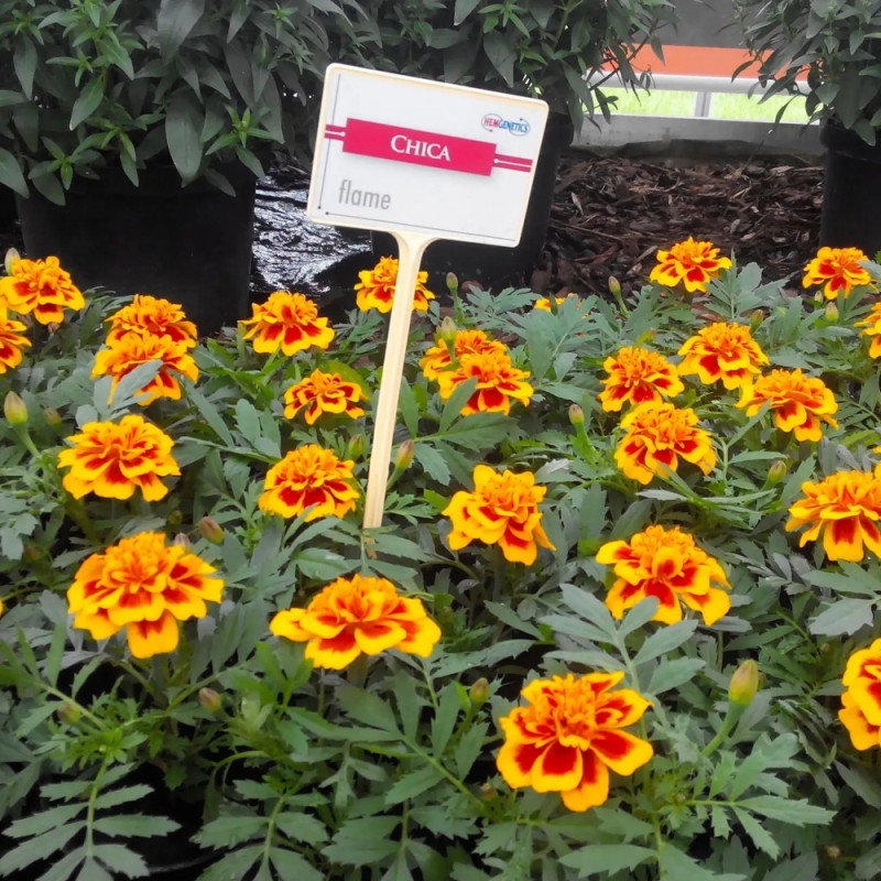 Чорнобривці Чіка флейм - ранньоквітуча серія з великими махровими квітами.