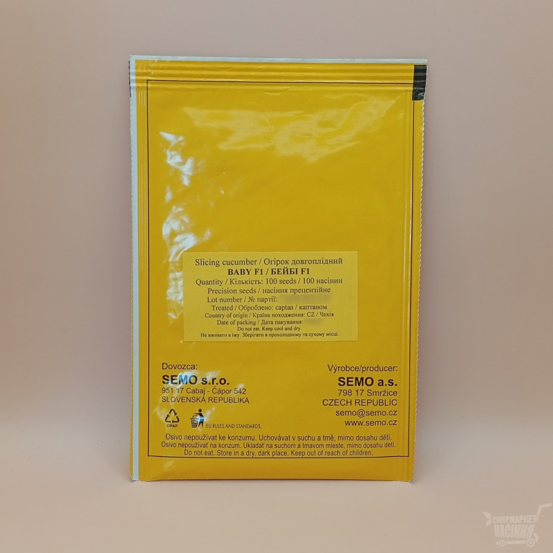 Бейбі F1 є середньораннім гібридом партенокарпічного огірка. Дозрівання завершується в період з 35-го по 40-й день. Плоди характеризуються середньою довжиною 8-16 сантиметрів, самі гладкі і без гіркоти. Смачний стиглий гібрид має забарвлення від зеленого до темно-зеленого.