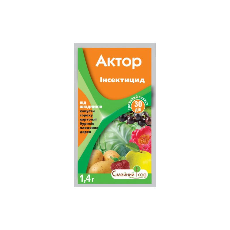 Яблуня, персик | Почковий довгоносик, букарки, яблучний квіткоїд, попелиці, плодовий пильщик | 1,4 г на 10 л води на 1 сотку | |