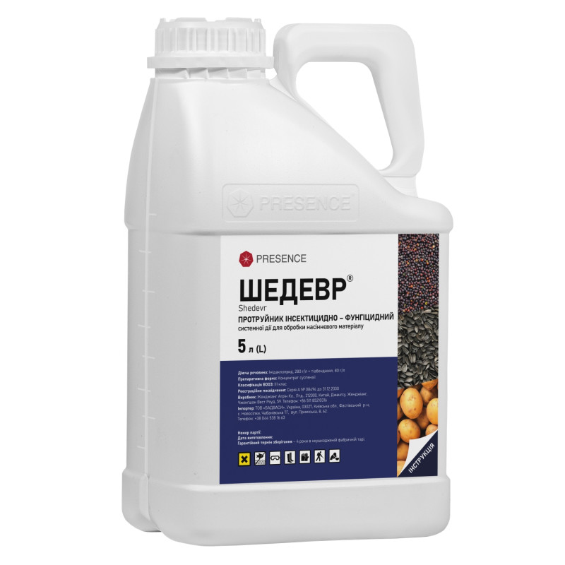 Протруйник Шедевр містить імідаклоприд, 280 г/л і тіабендазол, 80 г/л.