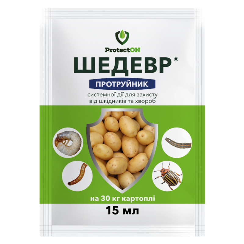 Протруйник Шедевр – препарат, який захищає рослини від захворювань і шкідників, так як містить два системні компоненти.