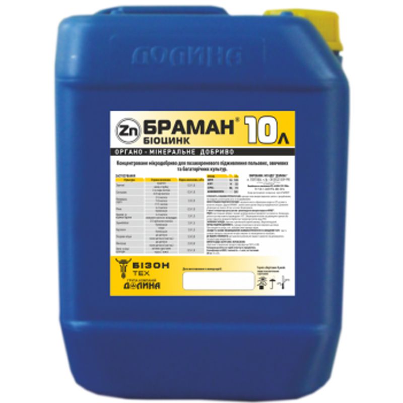 Браман Біоцинк - це добриво використовується для позакореневого внесення на посіви і насадження овочевих, зернових, плодових, ягідних і декоративних культур. Своїм впливом препарат створює додаткове підживлення цинком, сіркою і азотом в доступній хелатній формі. Завдяки цьому підвищується схожість, поліпшується розвиток і ріст кореневої системи, посилюється стійкість рослин перед стресовими погодними умовами і різними захворюваннями. Препарат може поєднуватися з багатьма добривами та ЗЗР.