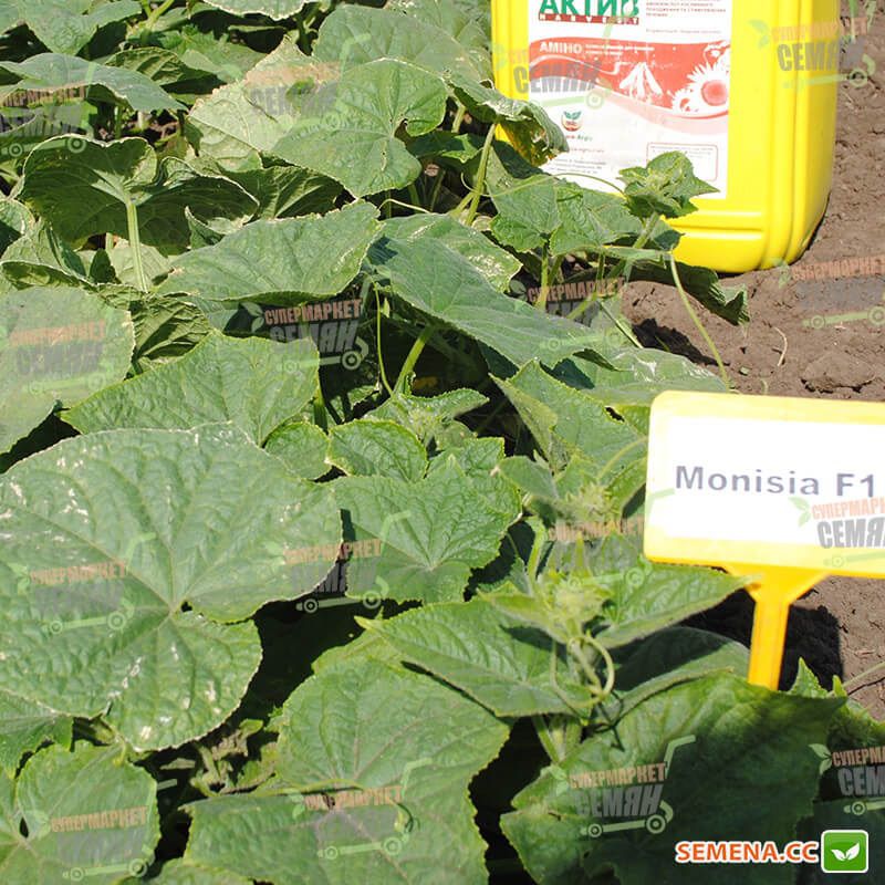 Монісія F1 є ранньостиглим гібридом партенокарпічного огірка. Після виникнення проростків вегетація займає ще 38-40 днів. Плоди приймають лаконічну і циліндричну форму, стають зовні крупнобугорчатими, а всередині щільними. Огірок стійкий до різних захворювань, включаючи кладоспоріоз. Гібрид для закритих і відкритих грунтів. Переробляється або вживається свіжим.