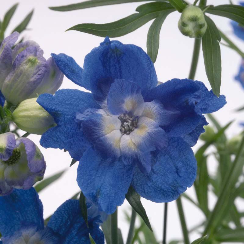 Дельфініум Саммер синій с білим вічком - рання генетично компактна серія з великою кількістю синіх квітів з білим вічком всередині.