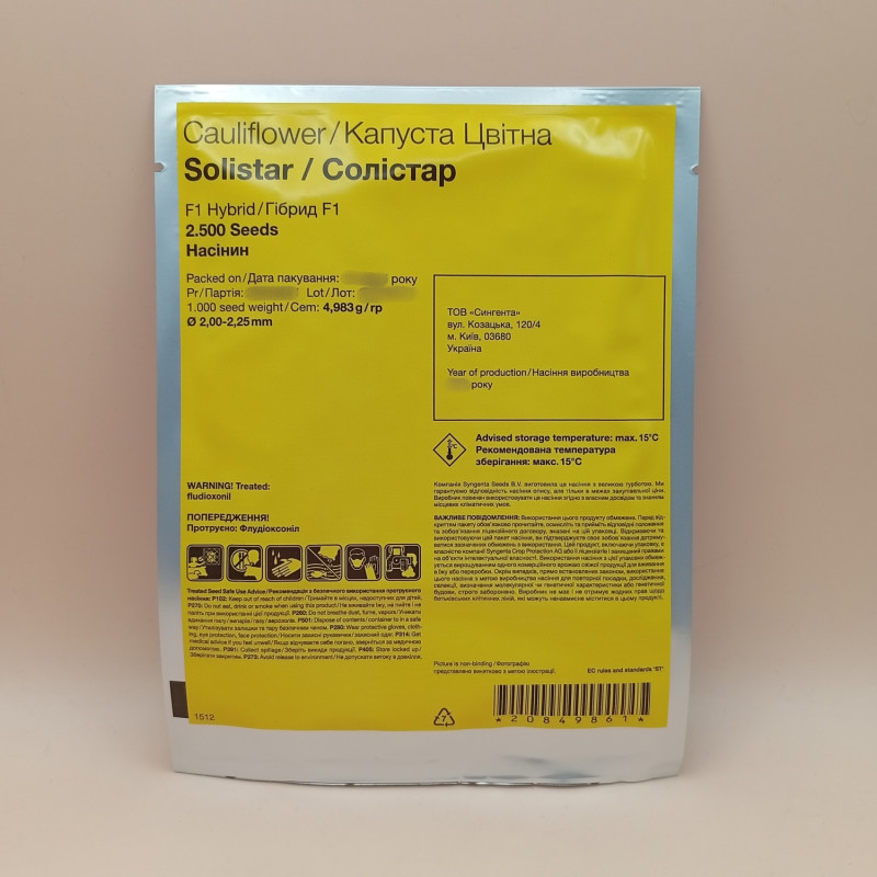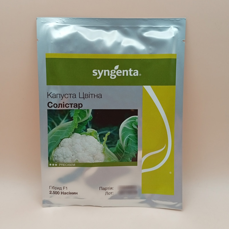 Солістар F1 - насіння цвітної капусти. Дозрівання триває 55-58 днів. Середня вага качана становить 1,5-2 кілограми. Спостерігається хороша вирівняність. Якість головок висока. Розрахований на свіжу реалізацію. Призначений для вирощування і збирання протягом раннього літа. Рекомендована густота посадки 30-35 тис/га.