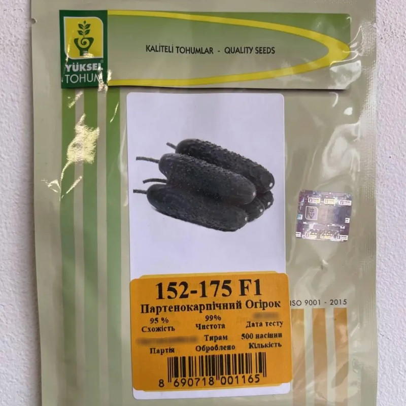 152-175 F1 - гібрид огірка корнішонного типу від Yuksel. Ранній термін вегетації. Сильне рослина середніх розмірів. Формує плоди циліндричної форми, колючі. Колір огірків насичено-зелений. Розмір плодів 11-13 см, діаметр 1,3-1,4 см.