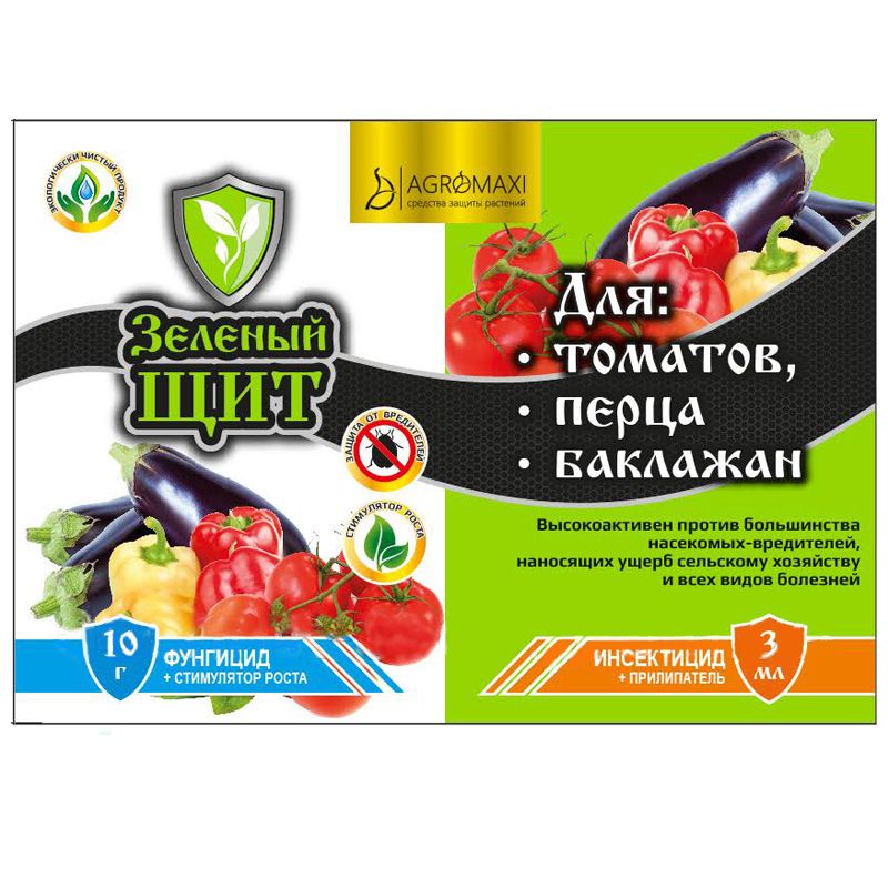 Зелений щит для томатів, перцю та баклажанів - комплексний препарат має в своєму складі інсектицид, фунгіцид, прилипач і стимулятор росту. Препарат неорганічного походження із суцільним впливом. Своїм впливом захищає культури від багатьох шкідників і захворювань. Завдяки наявності в складі стимулятора росту підвищує ростові процеси рослин. Прилипач покращує обробку препаратом рослини.