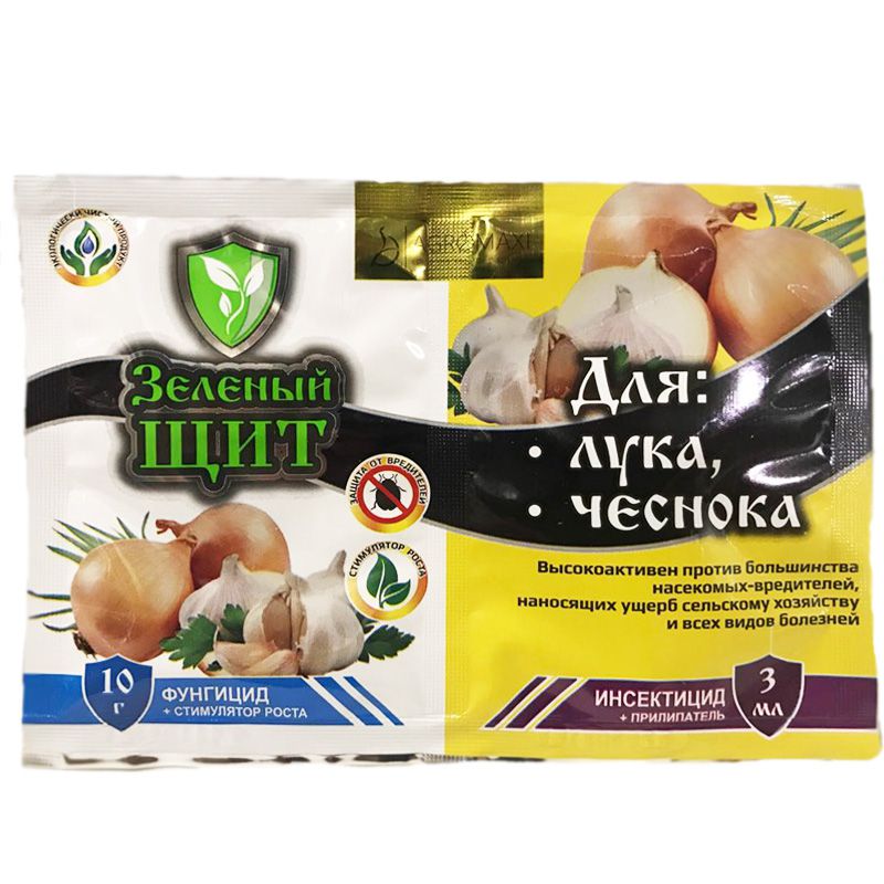 Зелений щит для цибулі та часнику - комплексний препарат має в своєму складі інсектицид, фунгіцид, прилипач і стимулятор росту. Препарат неорганічного походження із суцільним впливом. Своїм впливом захищає культури від багатьох шкідників і захворювань. Завдяки наявності в складі стимулятора росту підвищує ростові процеси рослин. Прилипач покращує обробку препаратом.