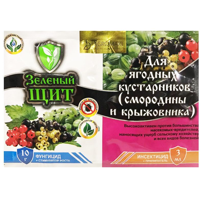 Зелений щит для ягідних кущів - комплексний препарат має в своєму складі інсектицид, фунгіцид, прилипач і стимулятор росту. Препарат неорганічного походження із суцільним впливом. Своїм впливом захищає культури від багатьох шкідників і захворювань. Завдяки наявності в складі стимулятора росту підвищує ростові процеси рослин. Прилипач покращує обробку препаратом.
