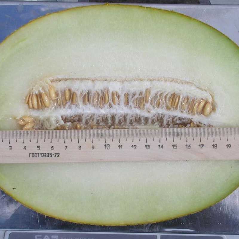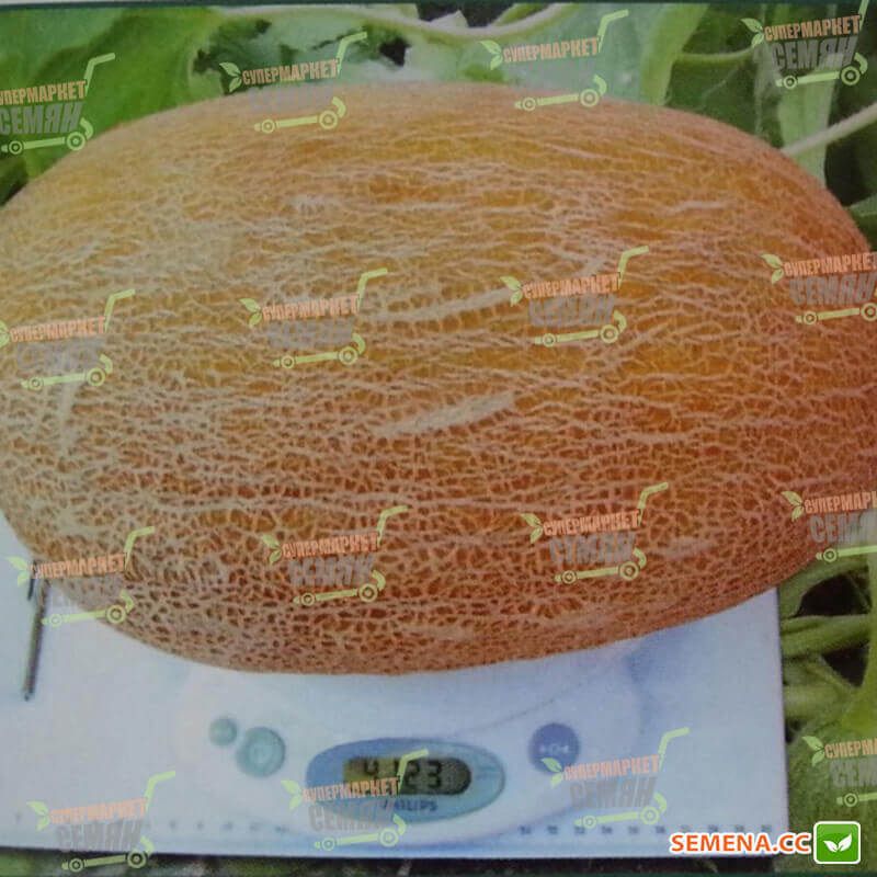 Плоди овальні, з яскраво вираженою сіткою на шкірці, середньої маси 2,5 – 3 кілограмів (перші дині нерідко досягають 4 кілограмів і більше). Світлий кремовий м'якуш з неймовірним ароматом. Диня з найсолодшим смаком – типовим для даного типу. Також плюсом цього гібриду є невелика насіннєва камера. Сильна рослина чудово в'яже лози з рясним та одночасним дозріванням урожаю (6 плодів на лозі).