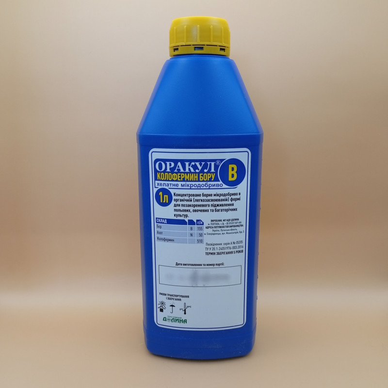Оракул колофермін бору - препарат призначений для усунення дефіциту бору в рослинах. Бор знаходиться в доступній для рослин формі - колофермінной. Найбільш вимогливі до бору рослини це цукрові буряки, соняшник, льон, картопля, зернобобові, зернові, люцерна і овочі. Вноситься позакореневим методом на більшість культур, які потребують додаткового внесення бору.