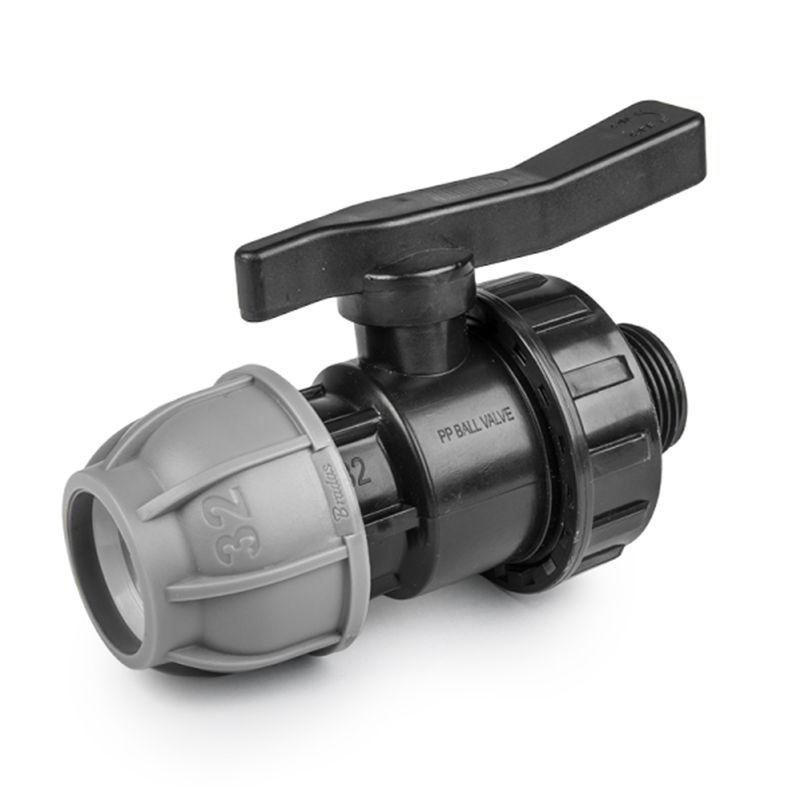 Кран 10 bar для труб РЕ 20мм з зовнішньою різьбою - сполучна арматура від Bradas. Використовується для регулювання або заглушки потоку води в зрошувальних системах / водопроводах, що складаються з поліетиленових труб.
