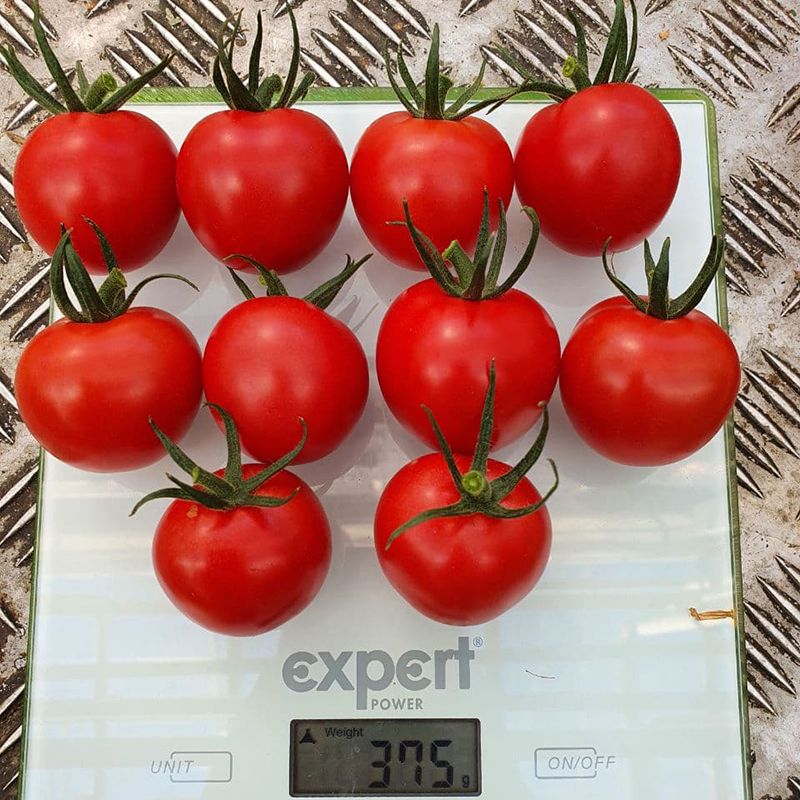 Характеристика плода – Формує однорідні, округлі плоди, вагою 20-30 г. Блискучі плоди мають гарний темно-рожевий відтінок і насичений смак, з чудовою текстурою. На китиці по 8-10 плодів. Високий вміст цукру.