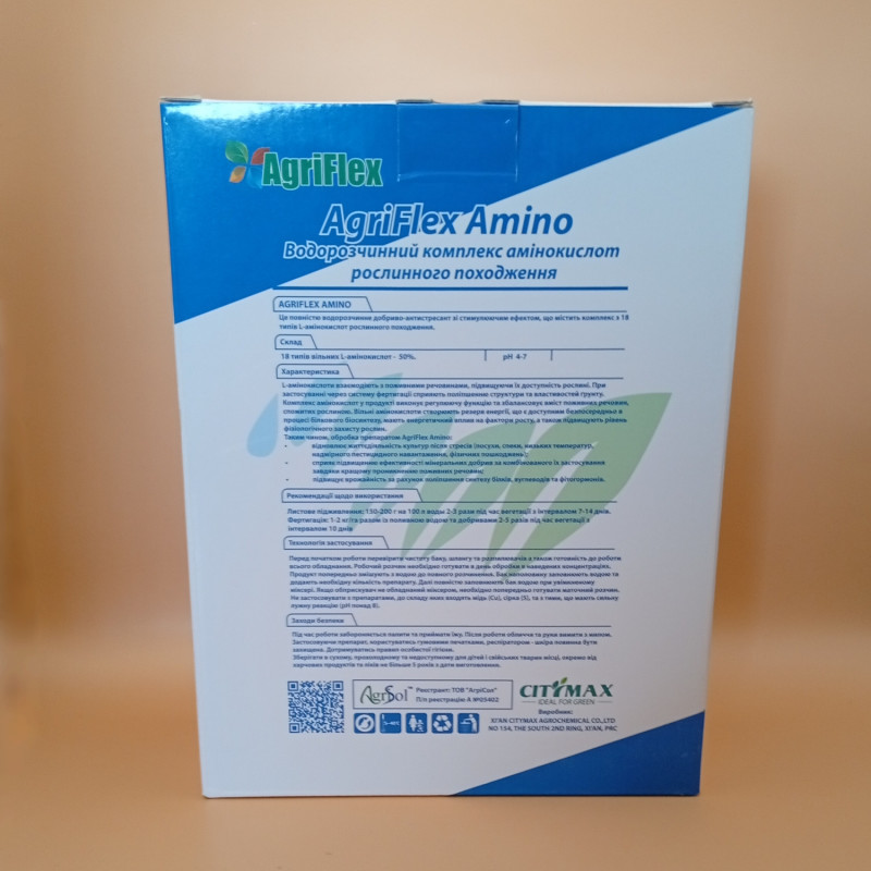 - це препарат, що містить комплекс з 18 типів L-амінокислот (не менше 50%) рослинного походження. Так як кожна амінокислота відповідає за певні функції в рослині, відповідно, чим більший набір амінокислот у препараті, тим більшого ефекту ми досягнемо. Використовується препарат, як некореневим способом (по листу), так і кореневою підгодівлею з поливної водою. Норма витрати препарату залежить від фази розвитку культури (для культур існують фази з найбільшою потребою амінокислот), зовнішніх факторів (опади, температура), грунтів.