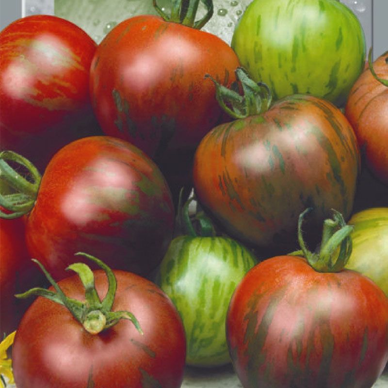 Середньостиглий сорт томату для теплиць і відкритого грунту. Індетермінантний, кущ висотою 1-1,3 м, вимагає підв'язки. Плоди округлі, вирівняні вагою до 110 г. Стиглі плоди - практично чорного кольору з червоними і жовтими смужками. Смак дуже приємний, солодкуватий з фруктовою кислинкою. Консистенція плодів помірно щільна, шкірка ніжна, прозора. Сорт урожайний і досить стійкий до захворювань. Чудово підходить для консервування та салатного застосування.