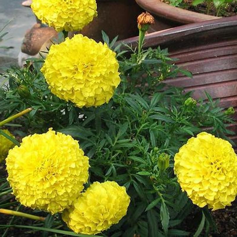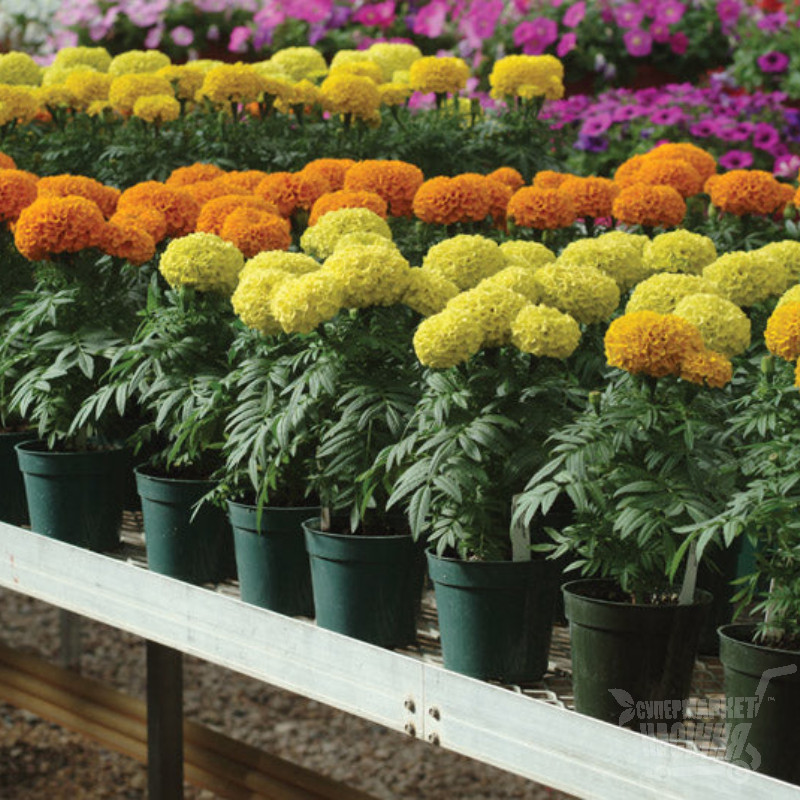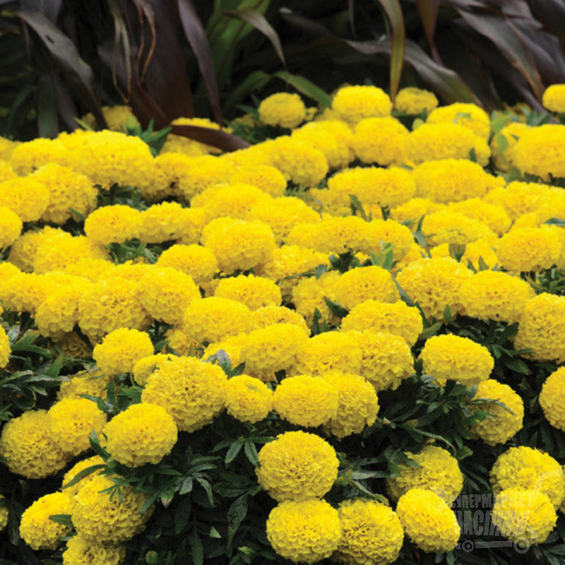 Чорнобривці Тайшан F1 лимонні прямостоячі африканські (Tagetes erecta Taishan F1 Yellow) – це крупноквіткова серія низькорослих чорнобривців висотою до 30 см.